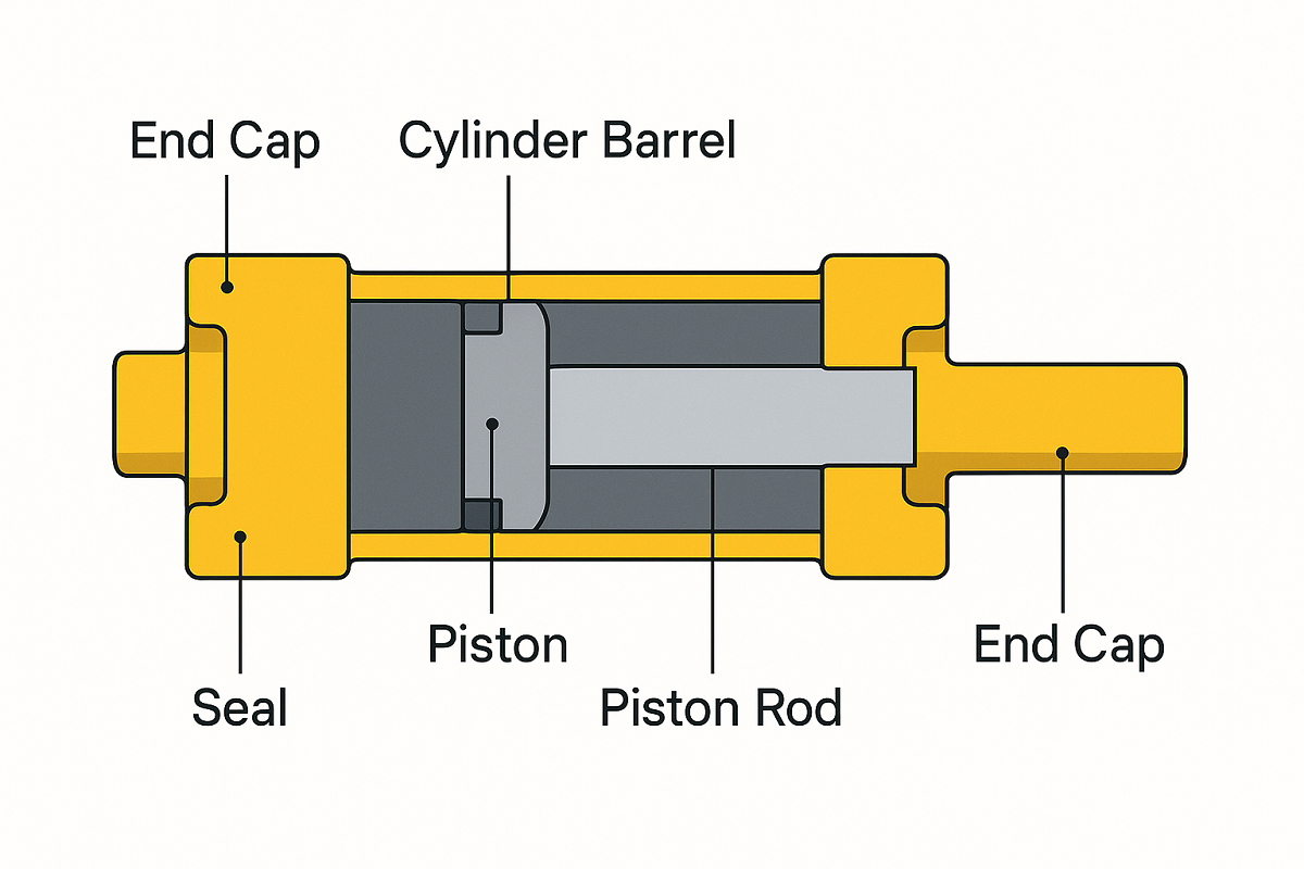 Figure 1: Basic structure of a hydraulic cylinder showing key components. الاسطوانات الهيدروليكية هي القوة وراء الآلات الحديثة تحويل الضغط الهيدروليكي إلى حركة خطية يمكن التحكم فيها. فهي حاسمة في البناء والتصنيع والزراعة والنقل والفضاء. من خلال فهم الأنواع المختلفة ومبادئ التشغيل والتطبيقات للأسطوانات الهيدروليكية، يمكن للمهندسين والمشغلين تحقيق أقصى استفادة الكفاءة والموثوقية والسلامة في عمليات الآلات.